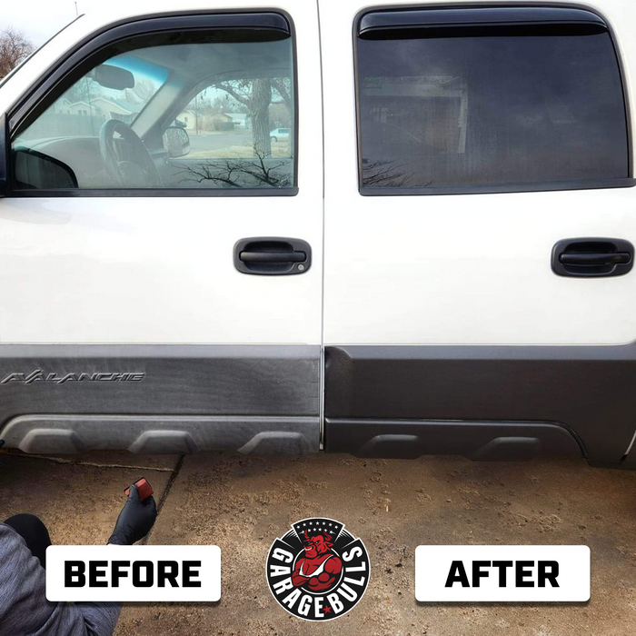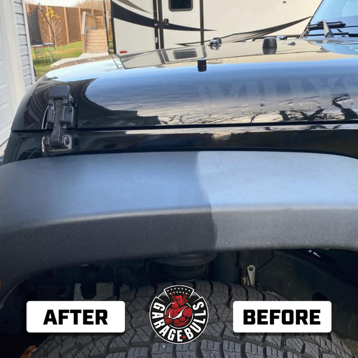 No. Unlike greasy dressings or temporary sprays, GarageBulls Plastic Restorer chemically bonds to the surface at a molecular level. It won’t wash off — even after rain, snow, or pressure washing.