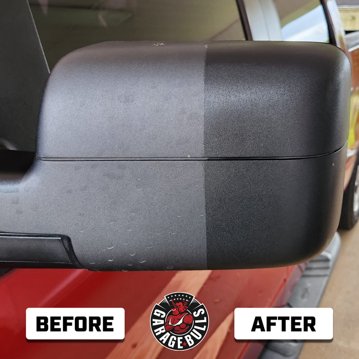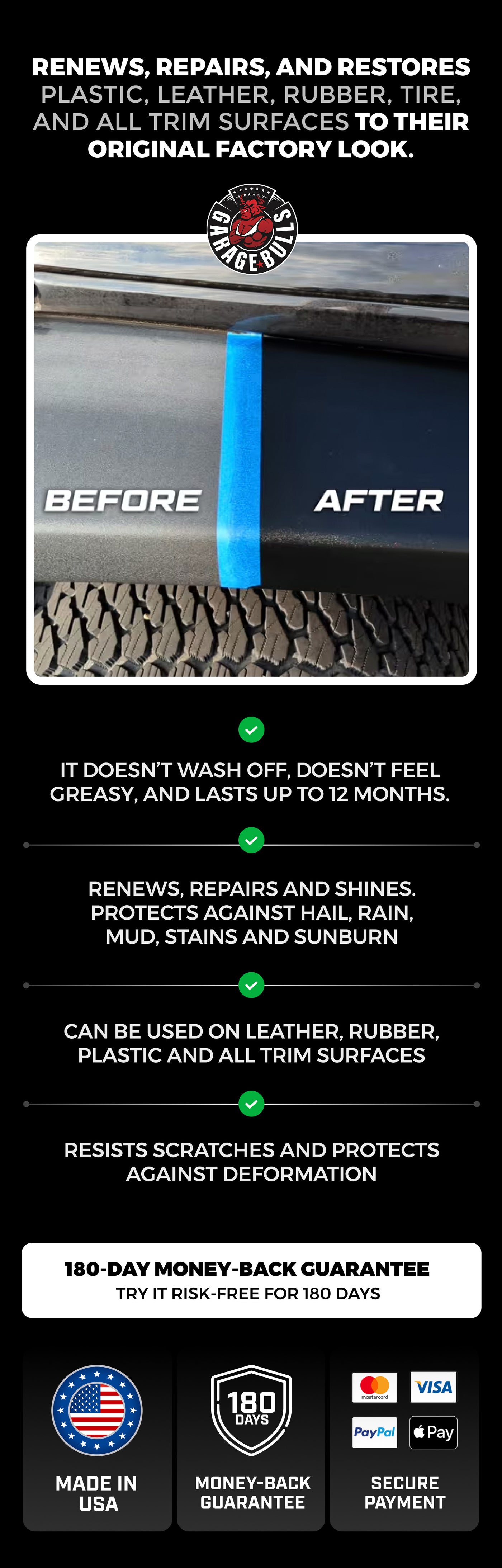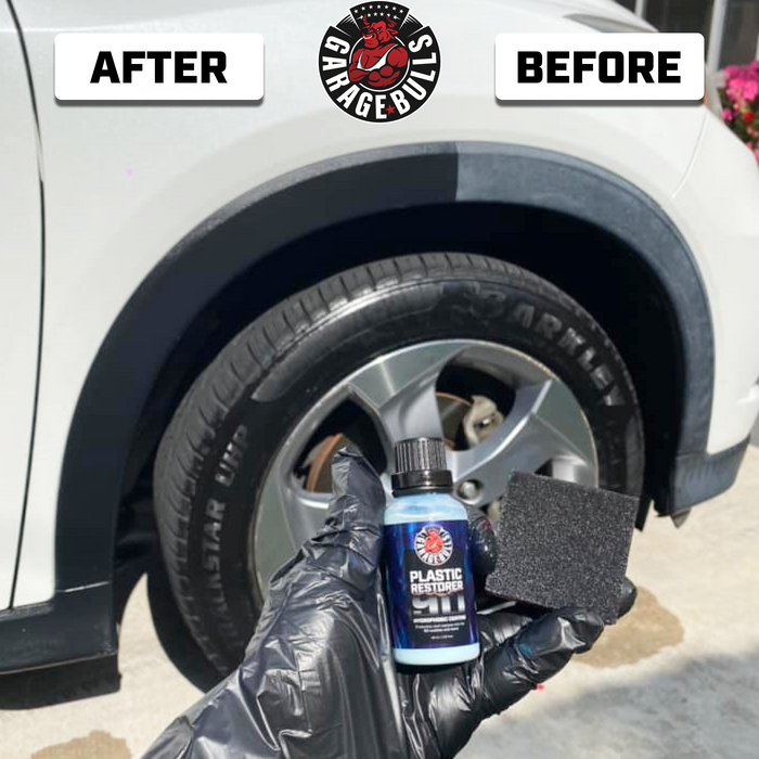 GarageBulls Plastic Restorer is a powerful, easy-to-use surface treatment designed to instantly restore faded plastic, vinyl, tire, leather and rubber trim back to a deep, like-new finish. Formulated with hydrophobic polymers, it leaves behind a rich, satin sheen that lasts through washes and harsh weather.