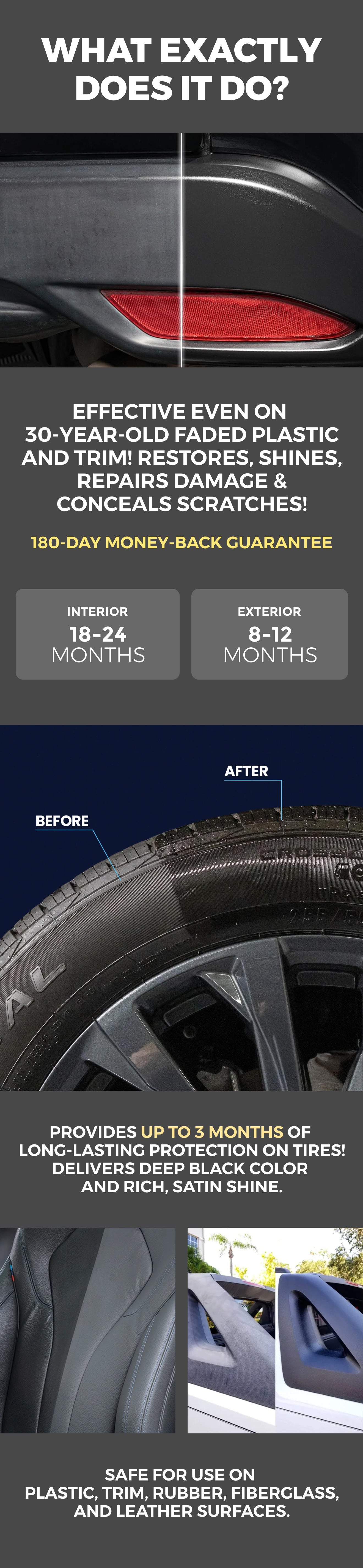 It bonds at the molecular level to create a long-lasting shine, protection, and a refined finish — lasting up to 18–24 months on interior plastics and 8–12 months on exterior plastics, depending on weather exposure.
